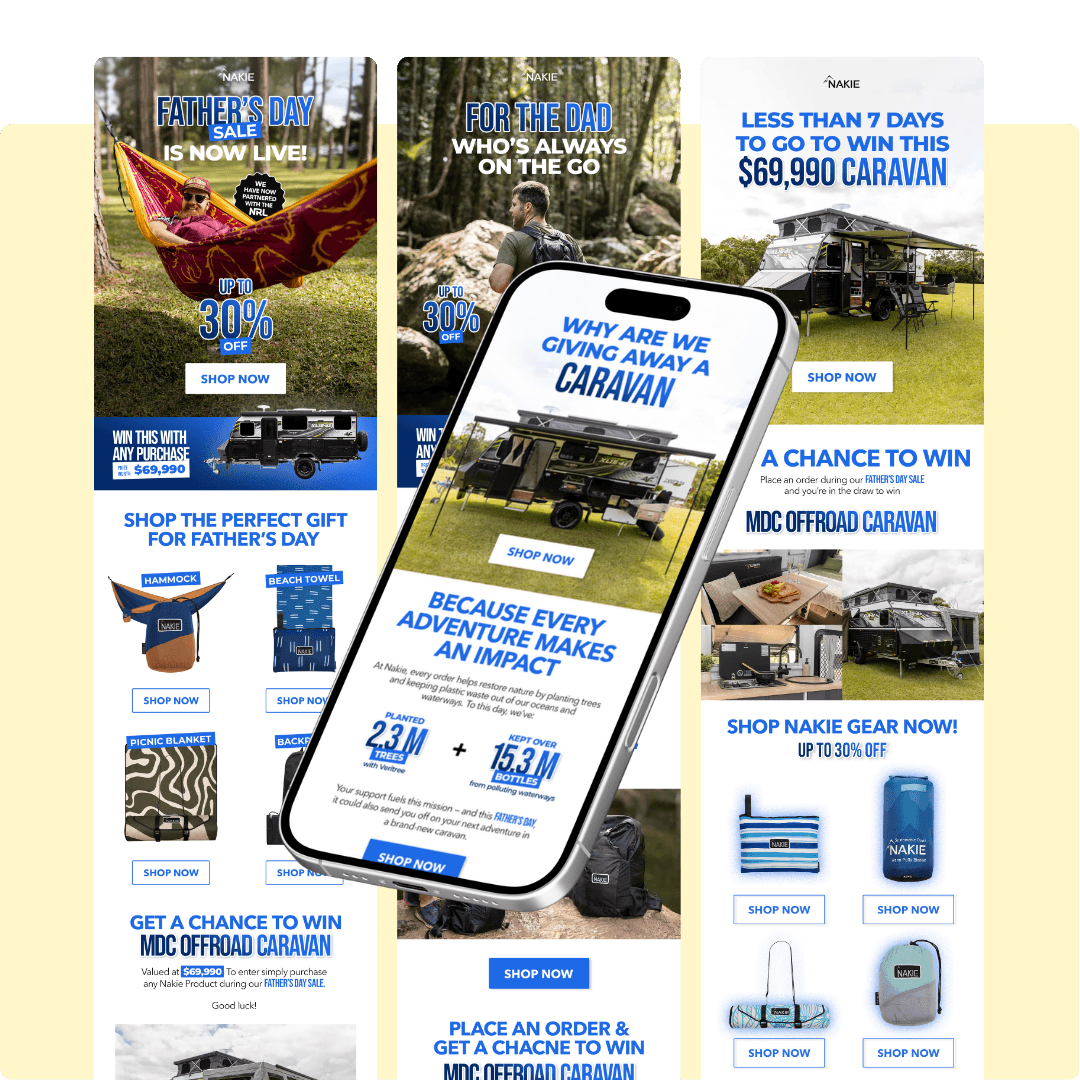 Nakie ran a Father's Day promotion featuring up to 30% off and a chance to win an MDC Offroad Caravan valued at $69,990. The campaign required a series of email designs to drive traffic...